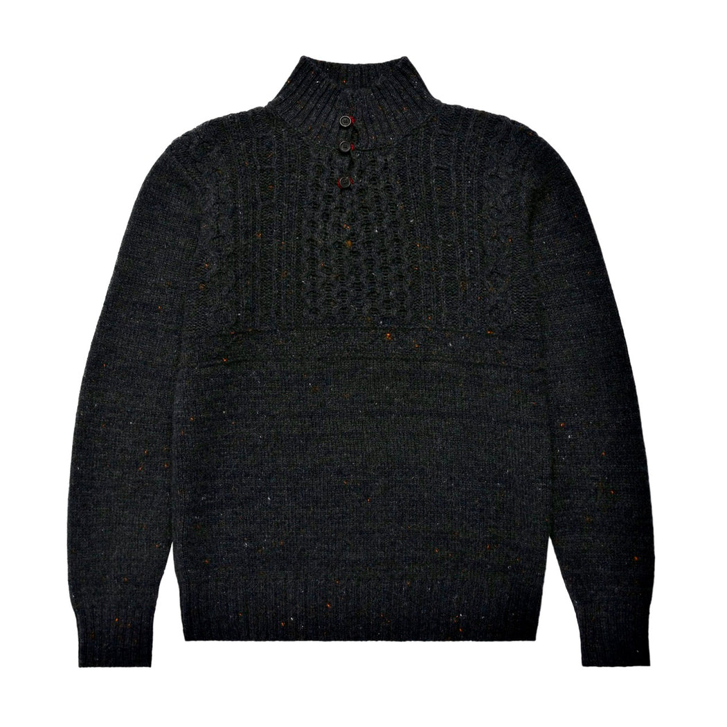 The original sweater was found in a barn on the island by founder, Tarlach de Blacam. This exclusive reknitting of the sweater features the intricate cables and stitches fashioned by Máire and a high neck finished with three horn buttons.