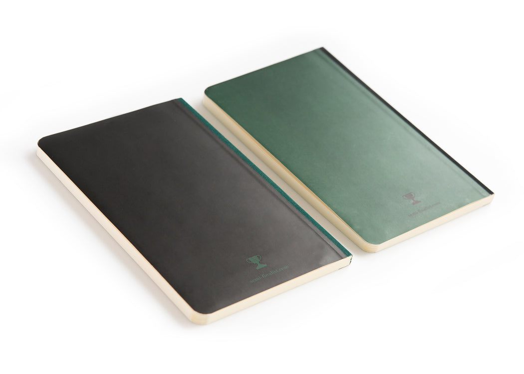 - Notebook two: tan front cover, black back cover, dark green fabric binding